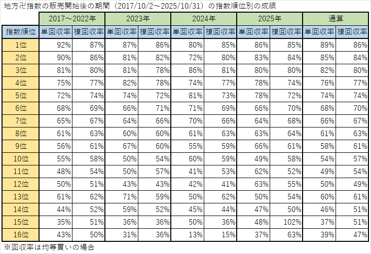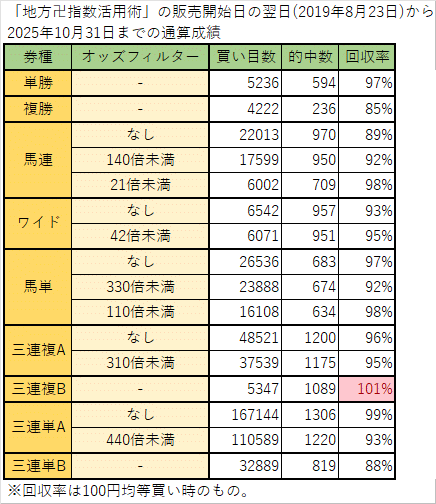 毎月、配信開始からの指数順位別、指数別の単勝回収率・複勝回収率の通算成績の最新版を公開!(※11/5更新)
