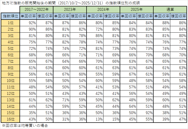 毎月、配信開始からの指数順位別、指数別の単勝回収率・複勝回収率の通算成績の最新版を公開!(※1/2更新)